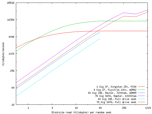The last two data points (ending in "Full drive seek") denote that random seeking was from the beginning to the end of the entire hard disk. The other tests seek inside the first 1 Gigabyte of the drive, to ensure some fairness in comparison to the smallest Compact Flash disk. The last two tests cover the whole disk to compare against these same two disks seeking over the first 1 Gigabyte. Seeking over the whole of the 4 Gigabyte CF was no different to seeking over the first 1 Gigabyte - as you would expect.