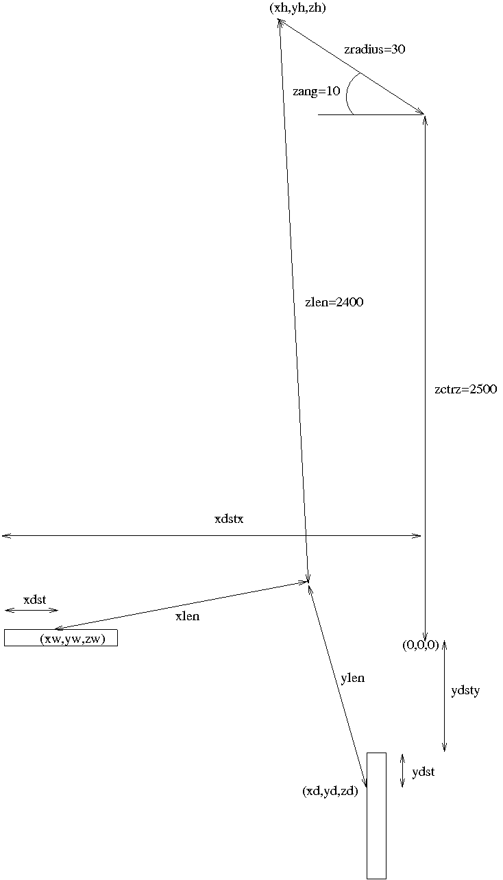 to give some idea about what the values currently are while running LinuxCNC. The various parameters come from this diagram. As this is a 3D diagram, to keep it readable only the major parameters are mentioned, ie, for the X joint, the x parameters are shown but not the corresponding y or z. The *len parameters are the arm lengths, the *dst and zang are the joint positions, the *dst* parameters are the offsets from a nominal (0,0,0) to the zero position of the joint. If anybody asks, I'll be forced to make diagrams from different angles, which creates the space to list them all.