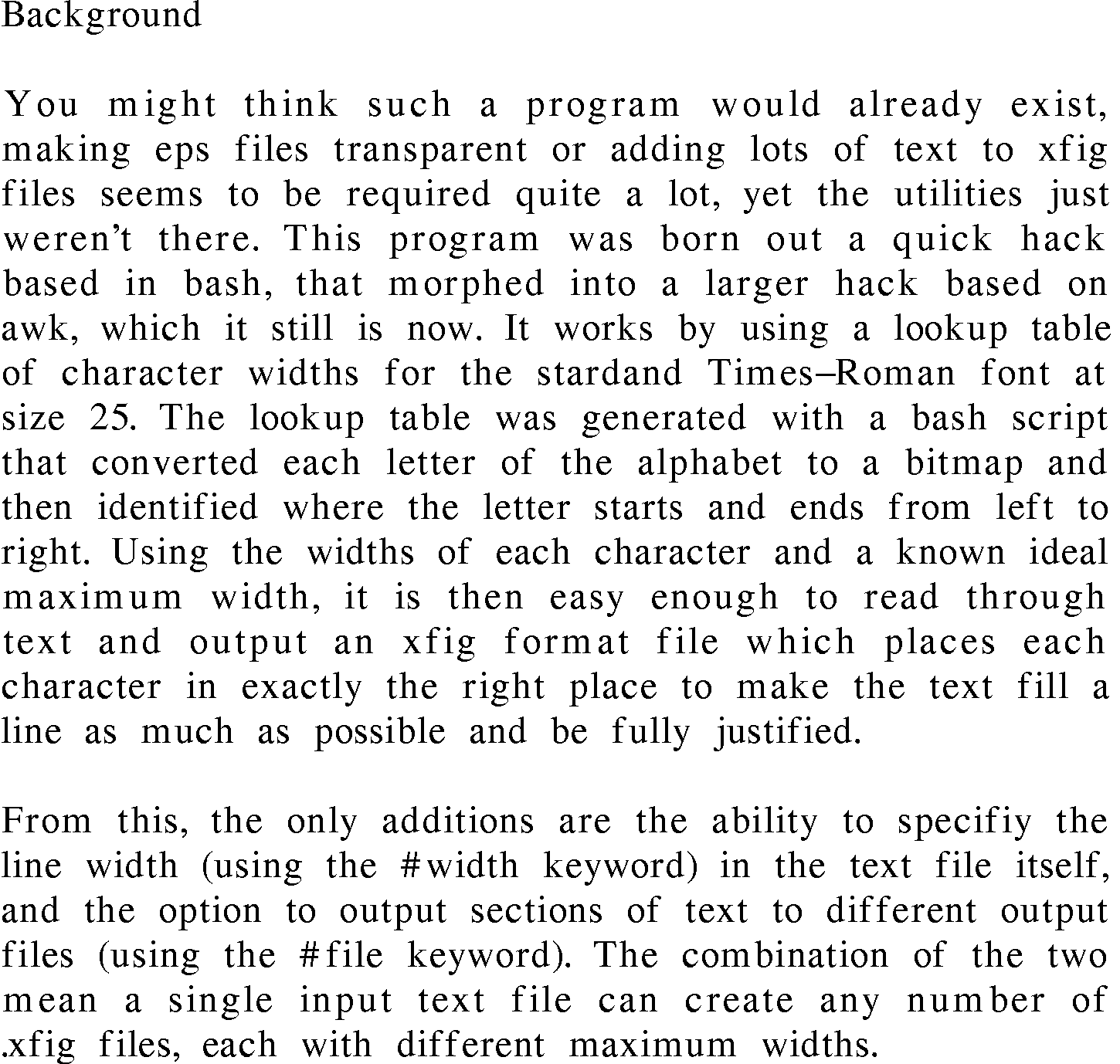 You might think such a program would already exist, making eps files transparent or adding lots of text to xfig files seems to be required quite a lot, yet the utilities just weren't there. This program was born out a quick hack based in bash, that morphed into a larger hack based on awk, which it still is now. It works by using a lookup table of character widths for the stardand Times-Roman font at size 25. The lookup table was generated with a bash script that converted each letter of the alphabet to a bitmap and then identified where the letter starts and ends from left to right. Using the widths of each character and a known ideal maximum width, it is then easy enough to read through text and output an xfig format file which places each character in exactly the right place to make the text fill a line as much as possible and be fully justified.